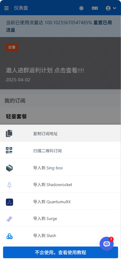 如果一键自动导入不成功,在 松果云仪表盘 向下滑动,找到 一键订阅,点击「复制订阅地址」