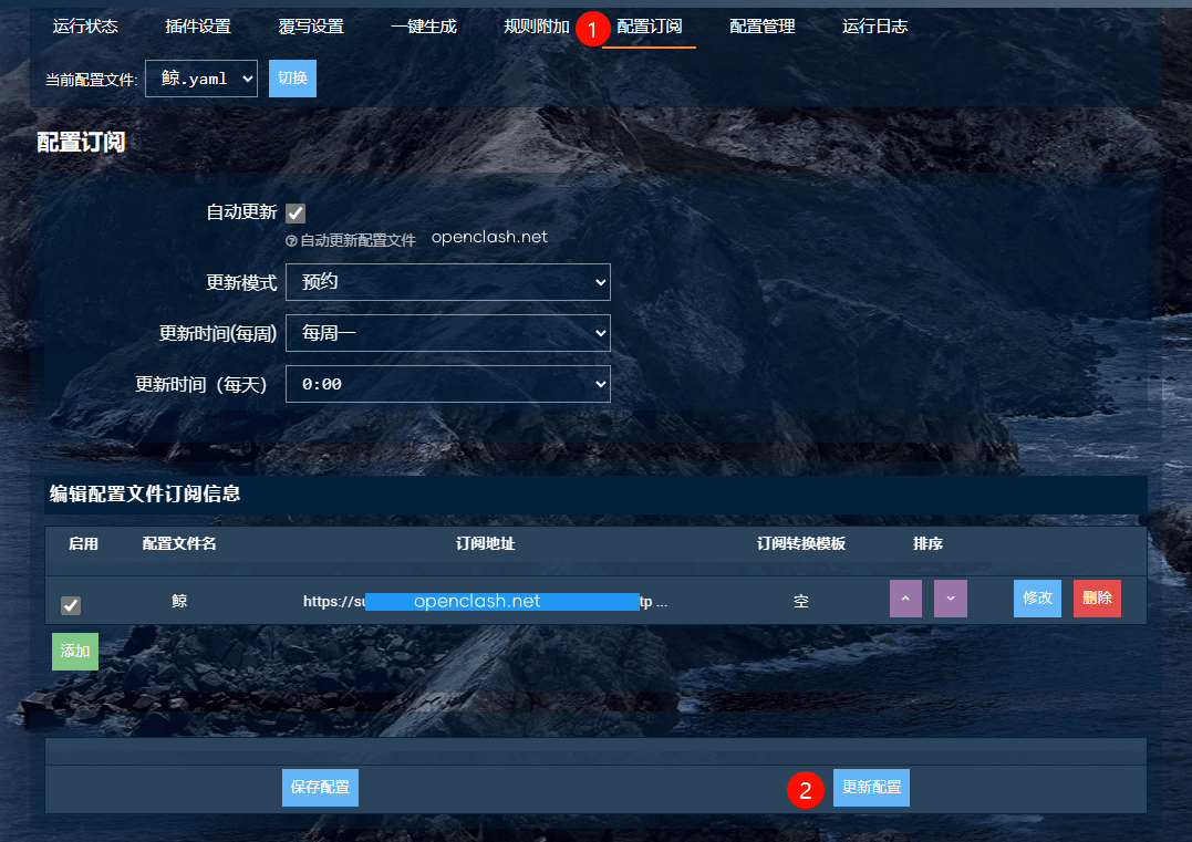 1、打开 OpenClash → 点击「配置订阅」 → 勾选「自动更新」 → 点击「添加」,如下图