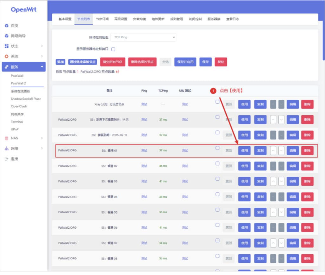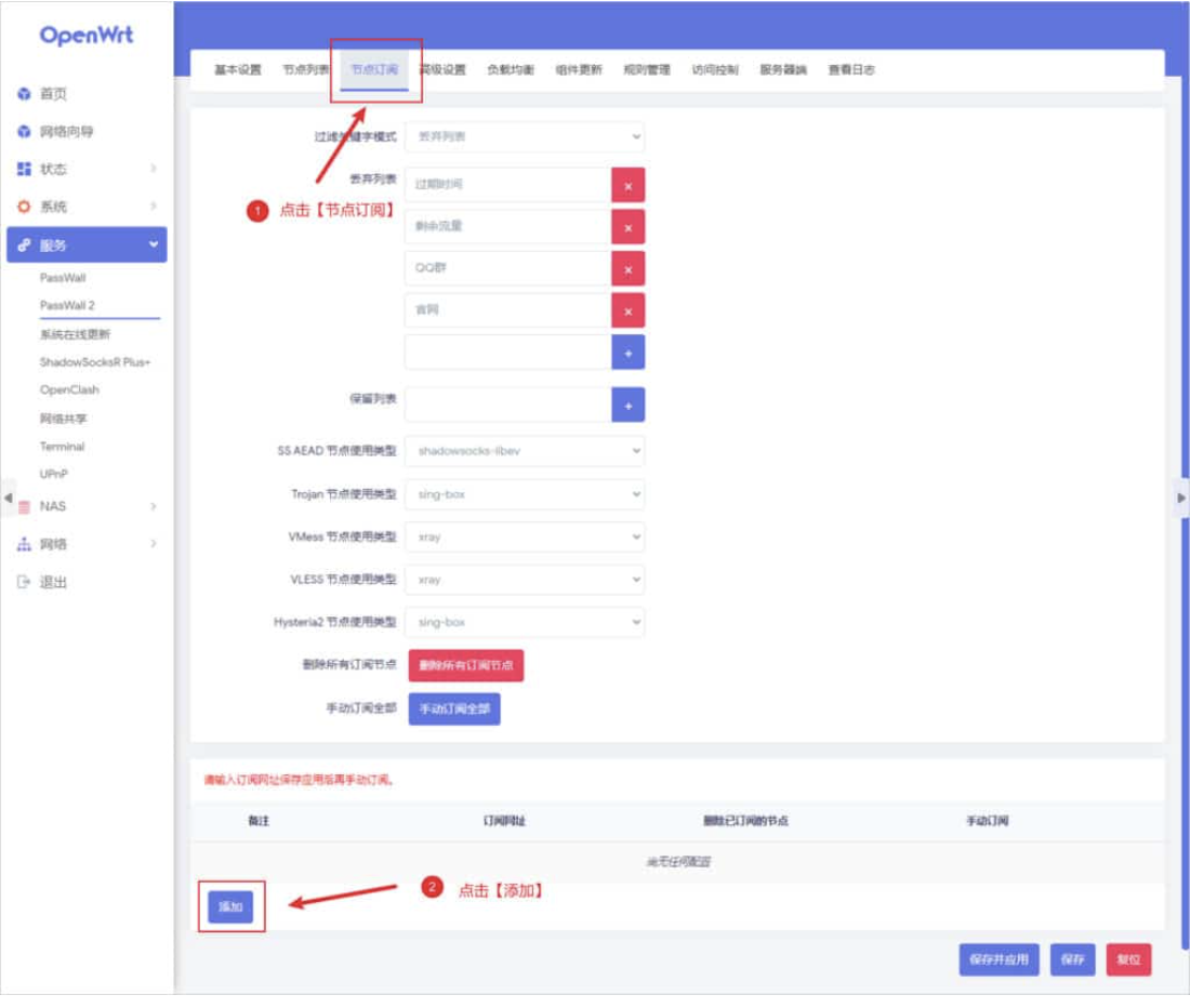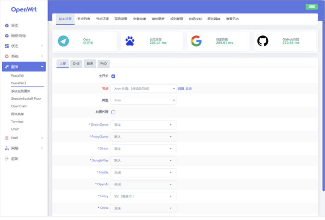 打开浏览器访问你的路由器后台(默认地址一般是 192.168.1.1)找到菜单 服务 → PassWall2,进入插件页面。本文主要讲述从节点订阅地址方式添加节点,一个有三个步骤,分别是复制订阅地址、导入订阅地址、开启系统代理。